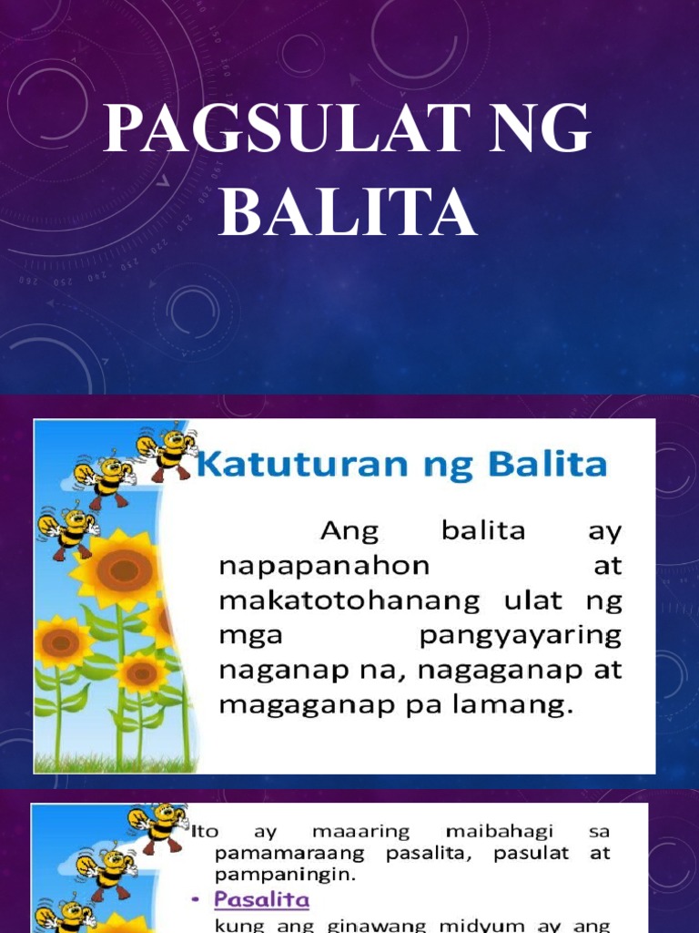 Ng Balita Ang Balita ay napapanahon at makatotohanang ulat ng pangyayaring naganap na nagaganap o magaganap pa lamang. Nagpapayaman ito ng talasalitaan. Kahalagahan ng Balita 1.