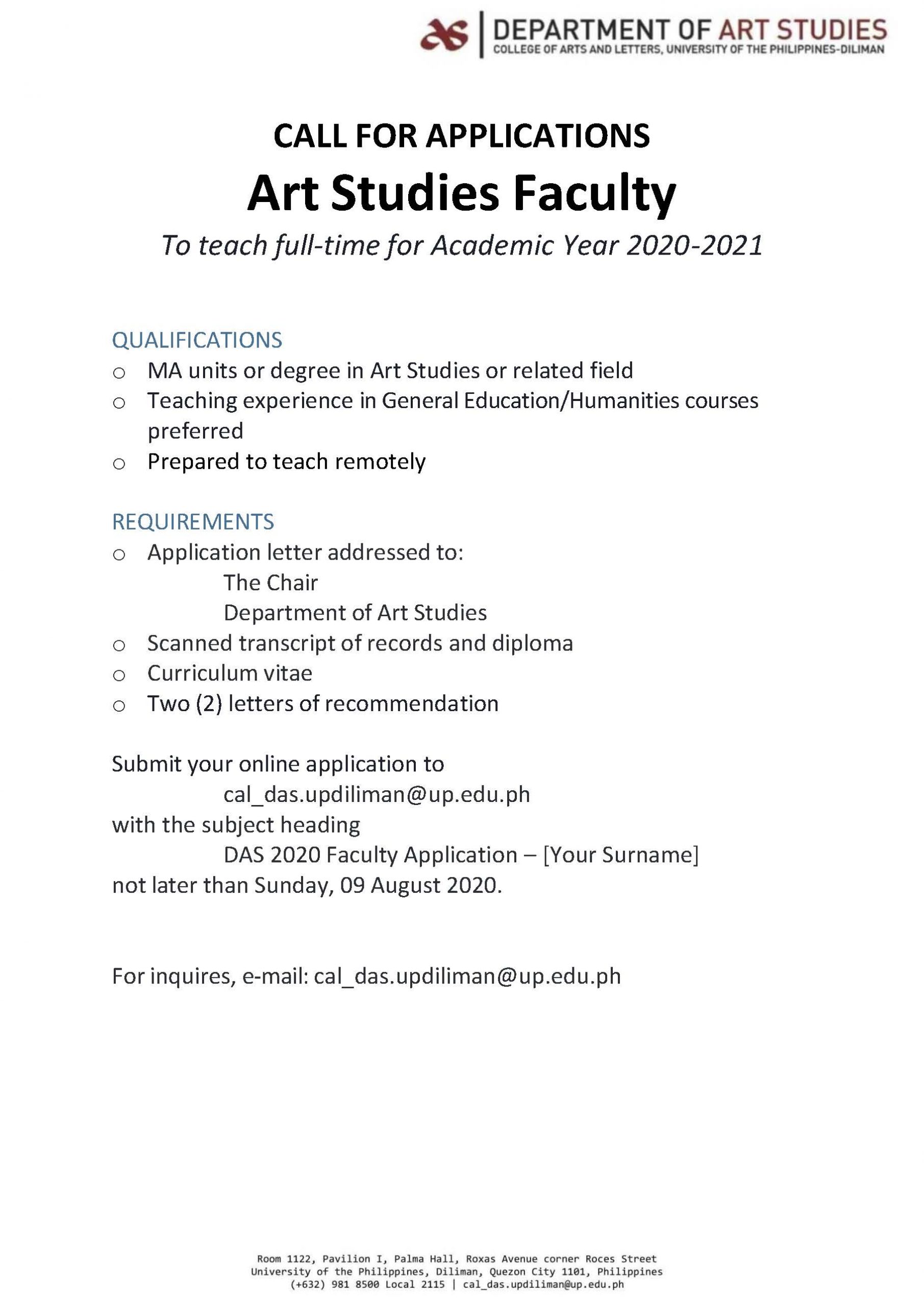 Call For Applications Art Studies Faculty Department Of Art Studies