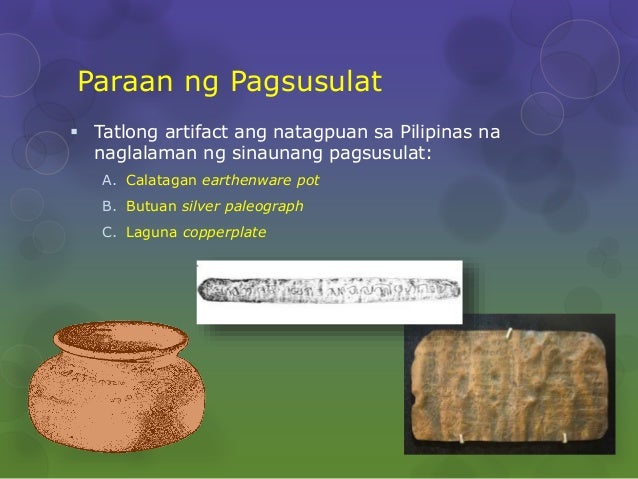Edukasyon ng Sinaunang Pilipino. Ang mga bagay na ito ang mga nakatulong sa ating mga ninuno sa paraan ng kanilang pamumuhay. Sa pagsulat din ang siyang paraan upang mag pa blater ng mga masasamang tao sa lipunan.