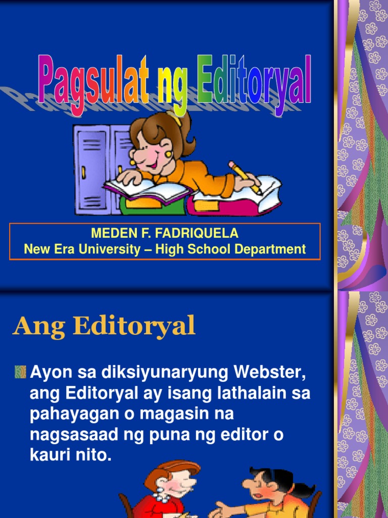 Ipinapasa mo yan sa amin. Ang editoryal ay isang bahagi ng pahayaganSa isang editoryal dito mababasa ang mga opinyon kuru-kuro at pananaw ng patnugot hinggil sa isang napapanahong isyu. Ang layunin ng akademikong pagsulat ay pataasin ang antas ng kaalaman ng mga mag-aaral sa pagbasa at pagsulat sa ibat ibang disiplina o larang.
