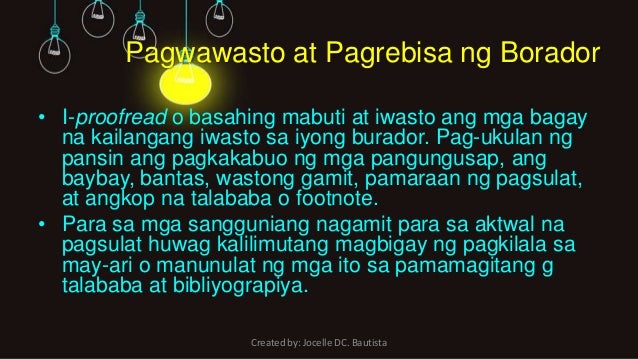 Pag-ukulan ng pansin ang pagkakabuo ng mga pangungusap ang baybay bantas wastong gamit pamaraan ng pagsulat at angkop na talababa o footnote. Pagsulat ng Borador o Draft para sa Iyong Pananaliksik. Nabubuo ito sa pamamagitan ng pagsasama-sama at pag-uugnay-ugnay ng mga nakalap na talla.