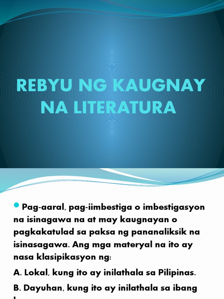 Ito ay ang mga reperensiya na inilathala sa Pilipinas lamang. Basahin at matuto sa link na ito -. Ang pagsulat ng rebyu ng kaugnay na literatura ay isang masinop matiyaga at maingat na bahagi ng iyong pananaliksik.